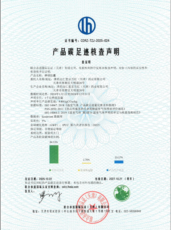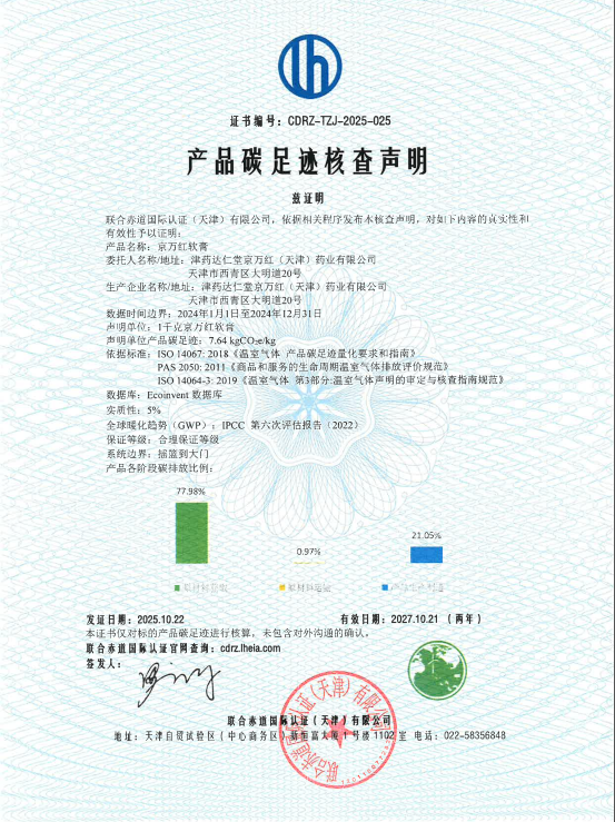 近日,津药达仁堂京万红(天津)药业有限公司旗下两大核心产品——京万红软膏与痹祺胶囊,顺利通过第三方权威机构碳足迹评价,正式获得碳足迹认证证书。这标志着两款传承已久的中成药在绿色低碳转型道路上迈出关键一步,成为中药行业践行"双碳"目标、发展新质生产力的典型标杆。