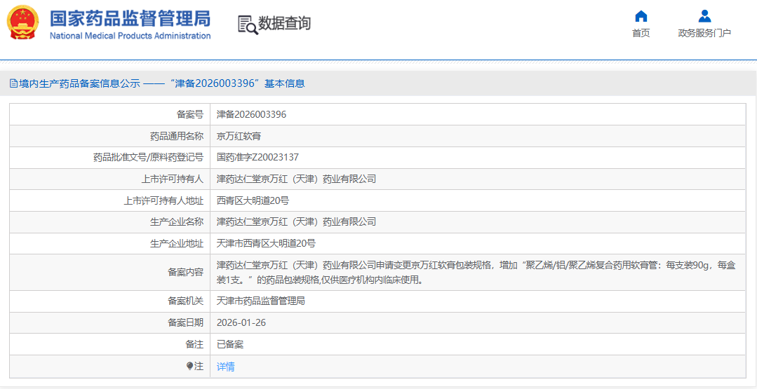 2026年03月30日,天津市药品监督管理局公示了我公司的备案申请,同意“京万红软膏(规格:每1g相当于饮片0.161g)变更包装规格,在原包装基础上增加‘聚乙烯/铝/聚乙烯复合药用软膏管,每支装90g’的药品包装包装。”